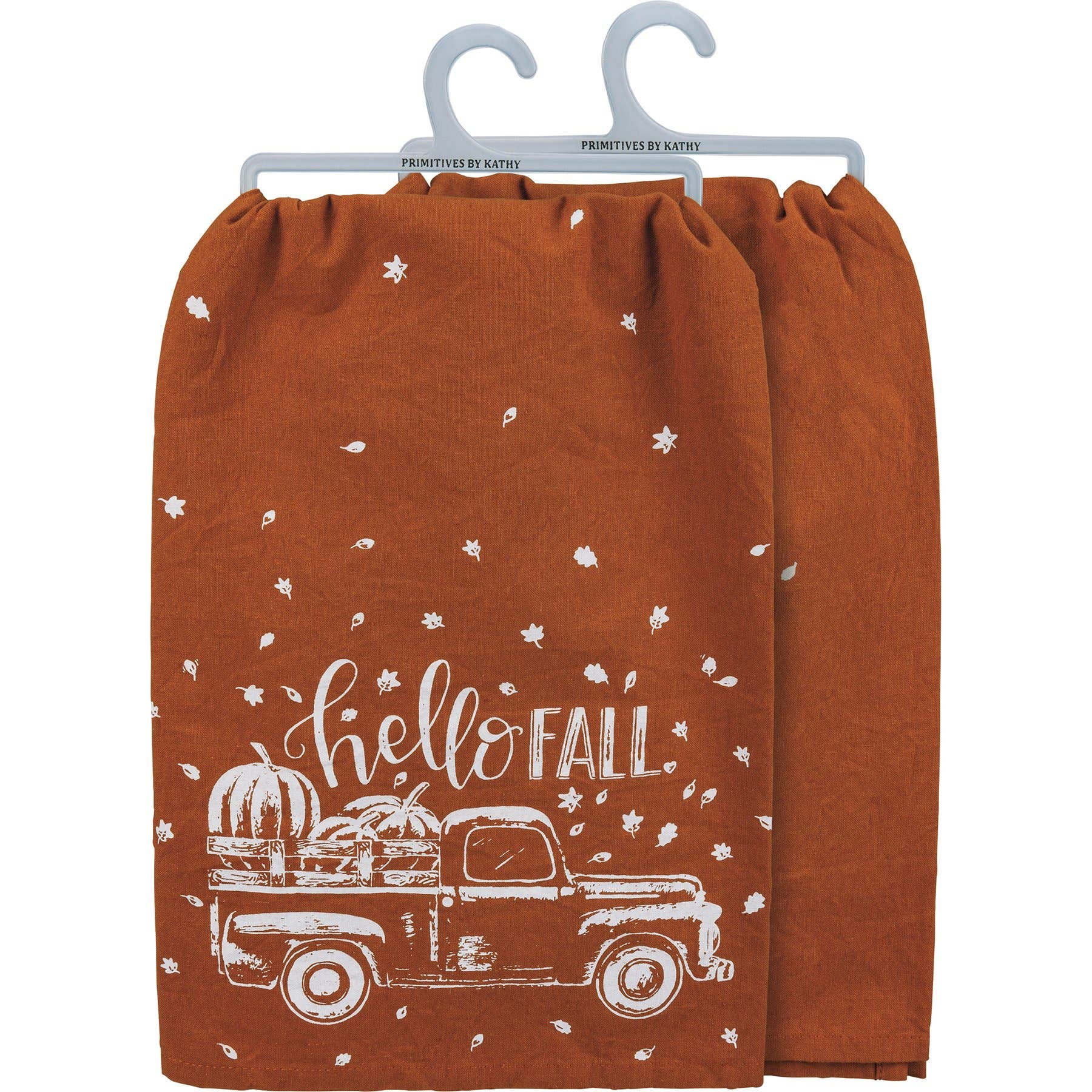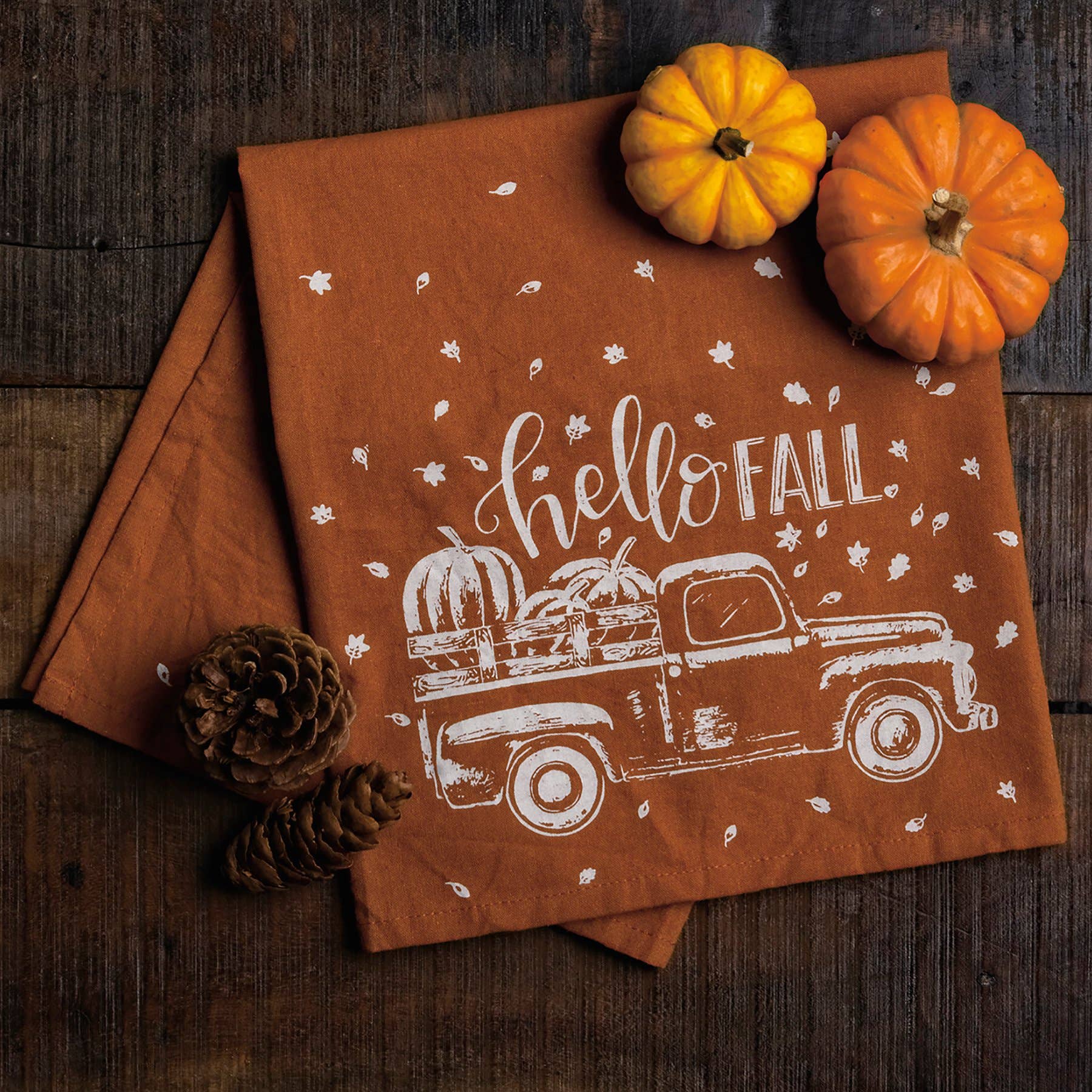 An orange cotton kitchen towel featuring a truck and pumpkin design with "Hello Fall" sentiment. Machine-washable.
